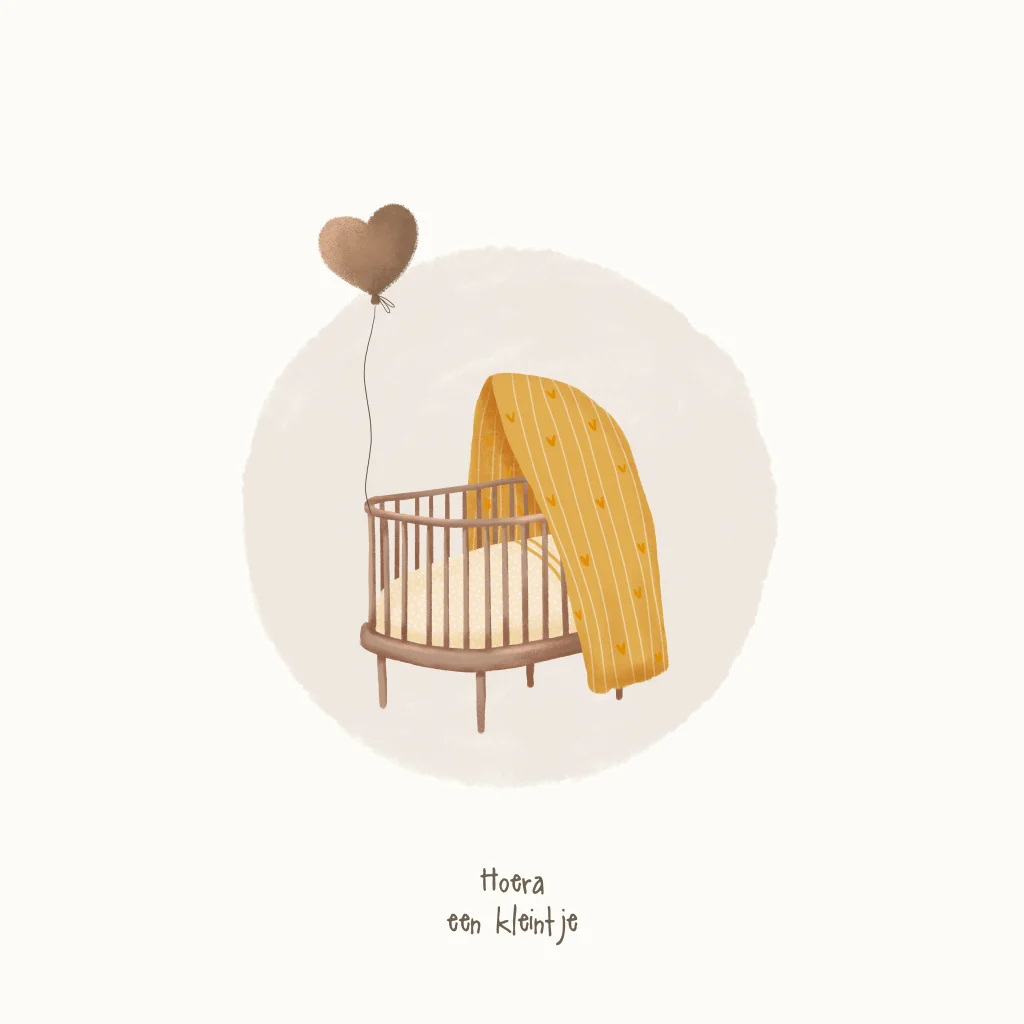 Een lieve felicitatiekaart met een schattig wiegje, zachte deken en een hartvormige ballon. Perfect om de geboorte van een kindje te vieren of om een zwangerschap te feliciteren of bekend te maken.