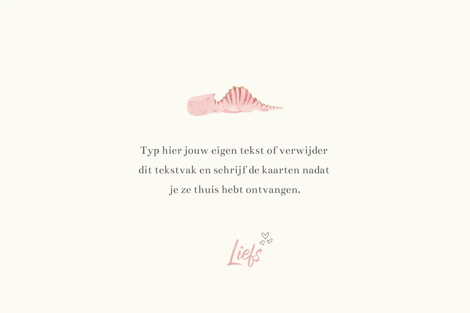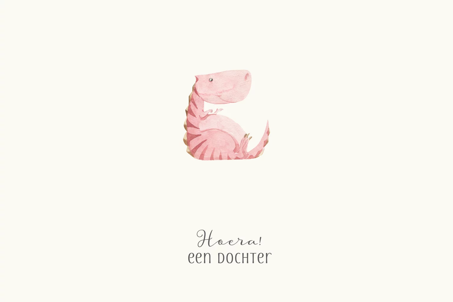 Lief kaartje om te sturen wanneer er een dochter geboren is. Met roze dino en de tekst Hoera! Een dochter. De tekst op de binnenzijde van de kaart kan eenvoudig aangepast worden in de online editor.