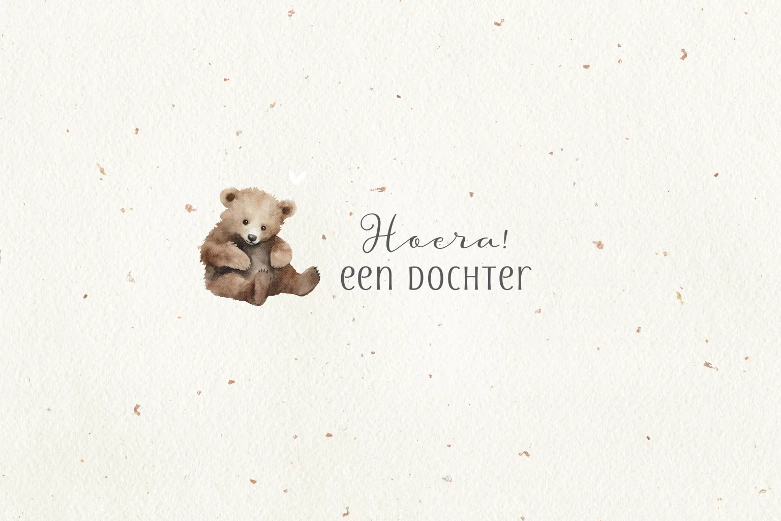 Lief kaartje om te sturen aan de trotse ouders wanneer er een dochter geboren is. Met schattig beertje en de tekst Hoera een dochter. De tekst aan de binnenkant van de kaart kun je eenvoudig aanpassen in onze online editor, zodat je een persoonlijke boodschap kunt toevoegen.