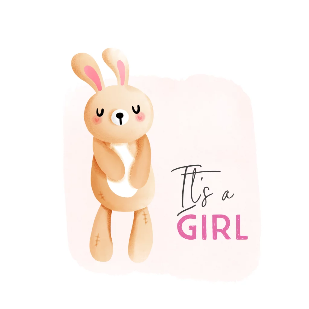 Lieve felicitatiekaart om de trotse ouders te feliciteren met de geboorte van hun dochter. Met lief knuffelkonijn en roze waterverf.