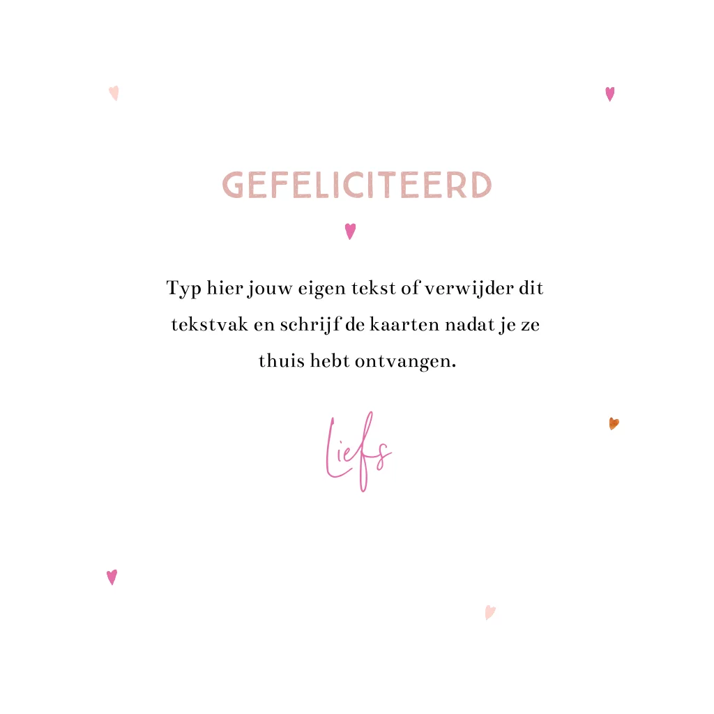 Op de voorzijde staat de tekst It's a girl, de tekst en het lettertype kun je eenvoudig zelf aanpassen. Aan de binnenkant kun je een persoonlijke felicitatie schrijven voor de kersverse ouders.