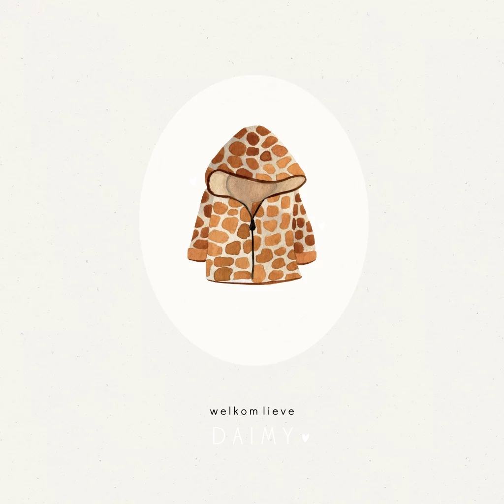 Een lief kaartje voor een felicitatie voor een verjaardag of geboorte. Met illustratie van een lief jasje met dierenprint en hartjes. Pas de tekst eenvoudig aan in de editor. Aan de binnenkant kun je een persoonlijk berichtje schrijven.