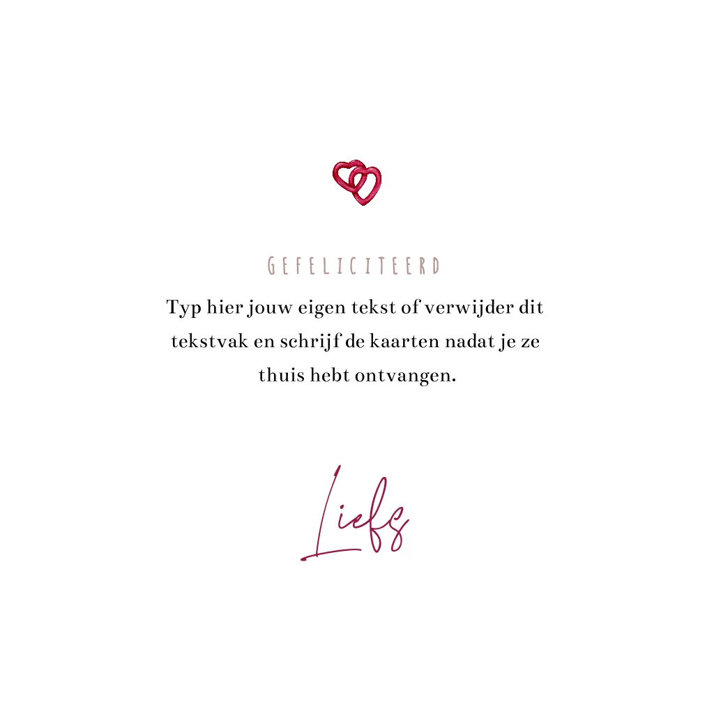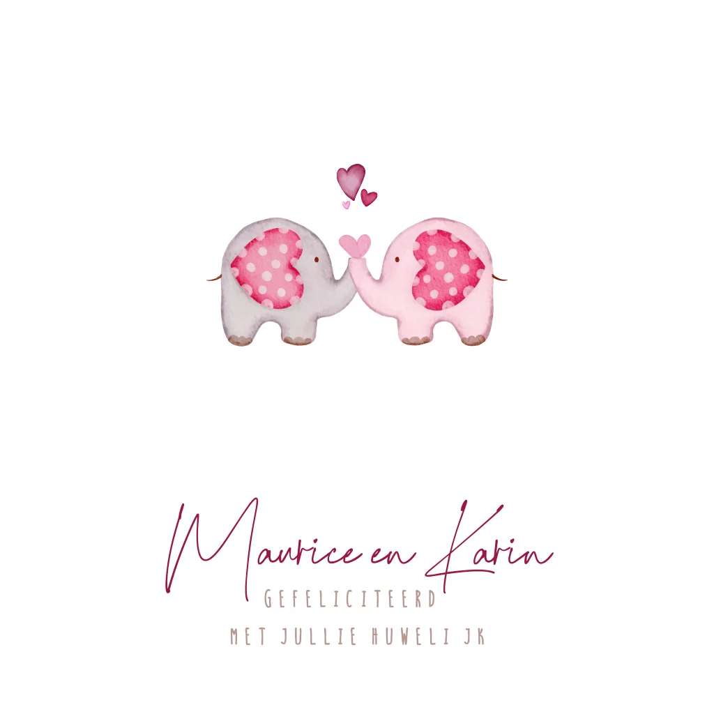 Feliciteer het bruidspaar met dit leuke kaartje met twee verliefde olifantjes en hartjes in waterverf. De namen en de tekst Gefeliciteerd met jullie huwelijk kun je eenvoudig aanpassen in de editor zodat je de kaart ook voor Valentijnsdag of een andere gelegenheid kunt gebruiken. Vier de liefde ♡