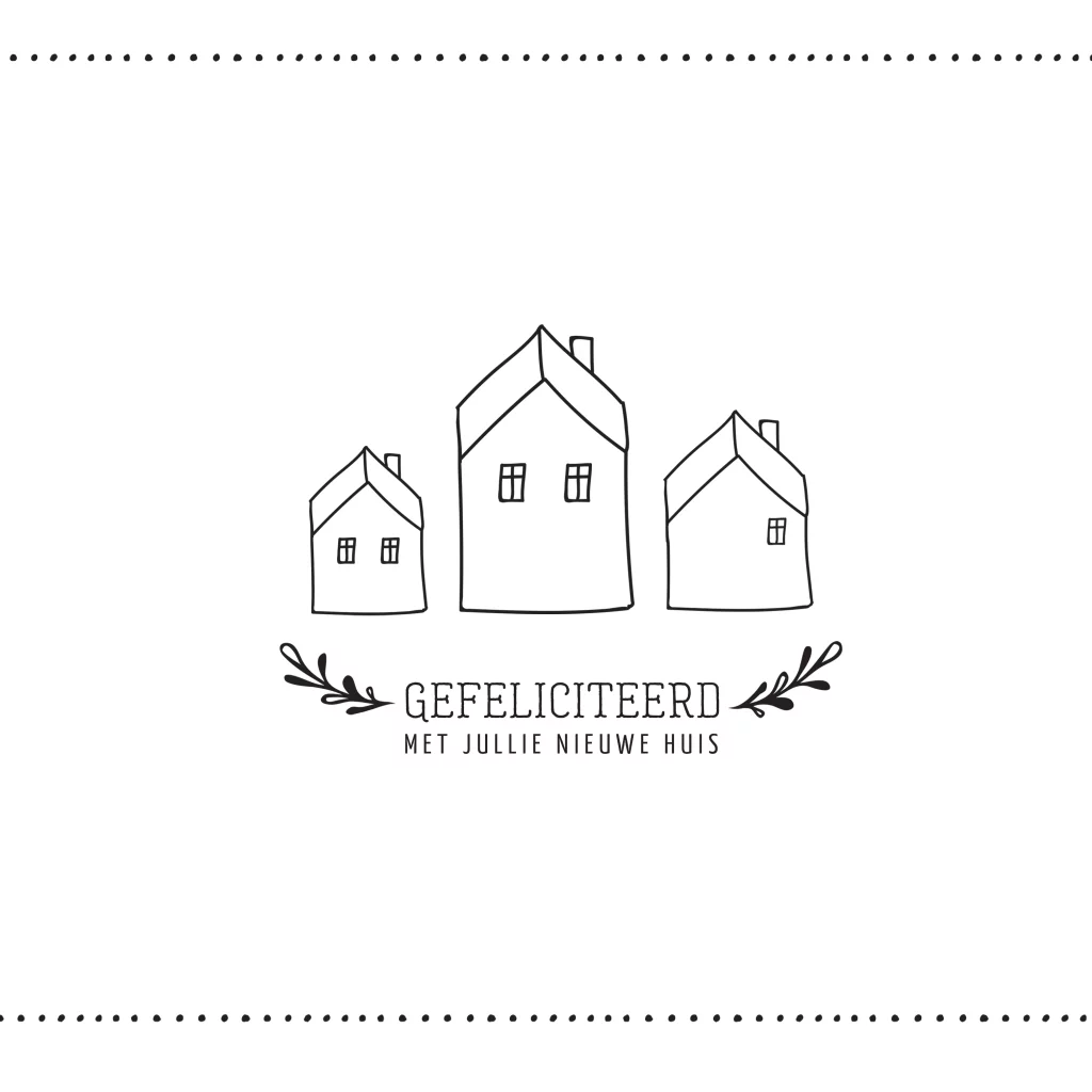 Een stijlvolle en minimalistische kaart om iemand te feliciteren met zijn of haar nieuwe woning. Op de voorzijde drie getekende huisjes en sierlijke takjes.