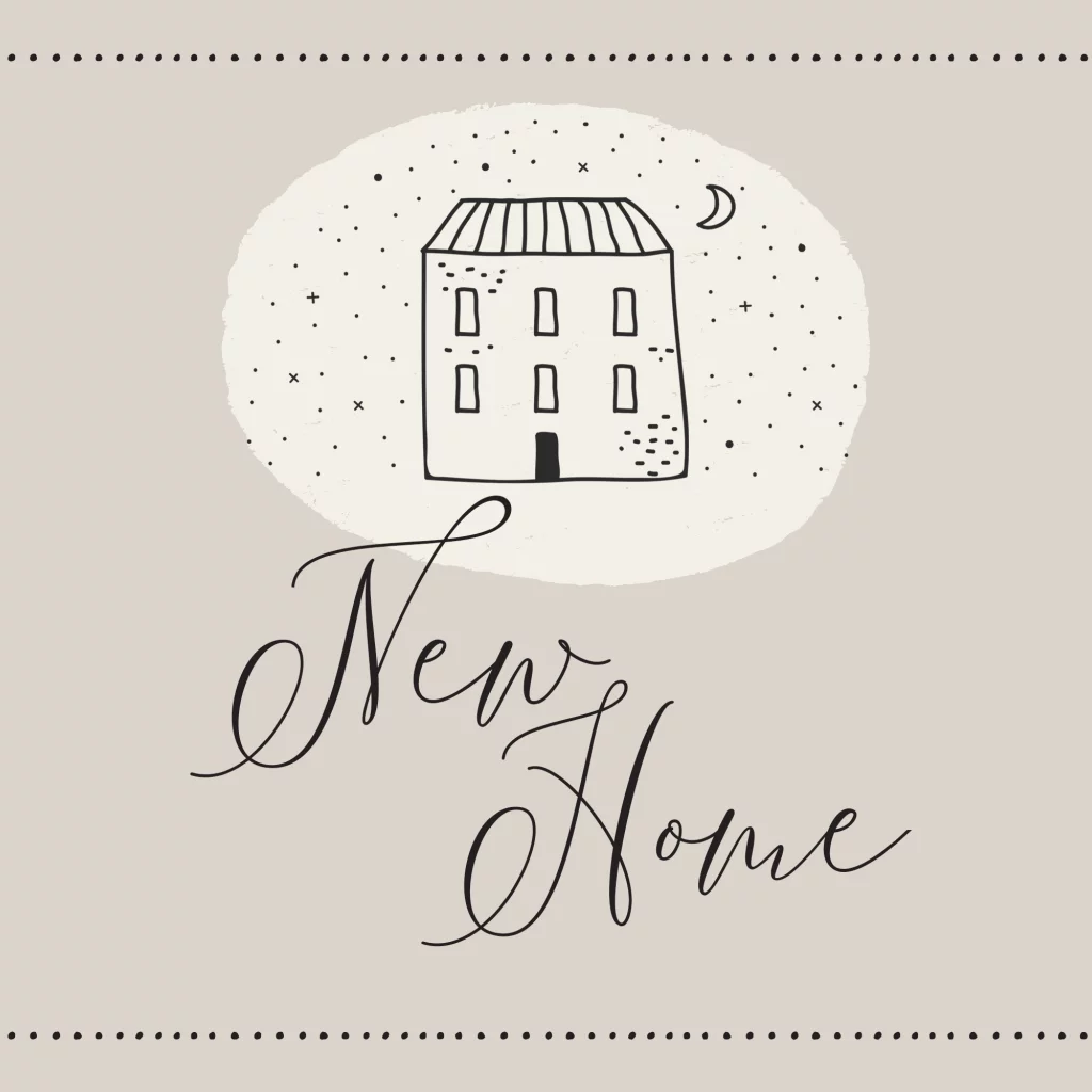 Een leuke felicitatiekaart in natureltinten om iemand te feliciteren met zijn of haar nieuwe woning. Op de voorzijde een illustratie van een huisje. Daaronder in sierletters de tekst New Home.