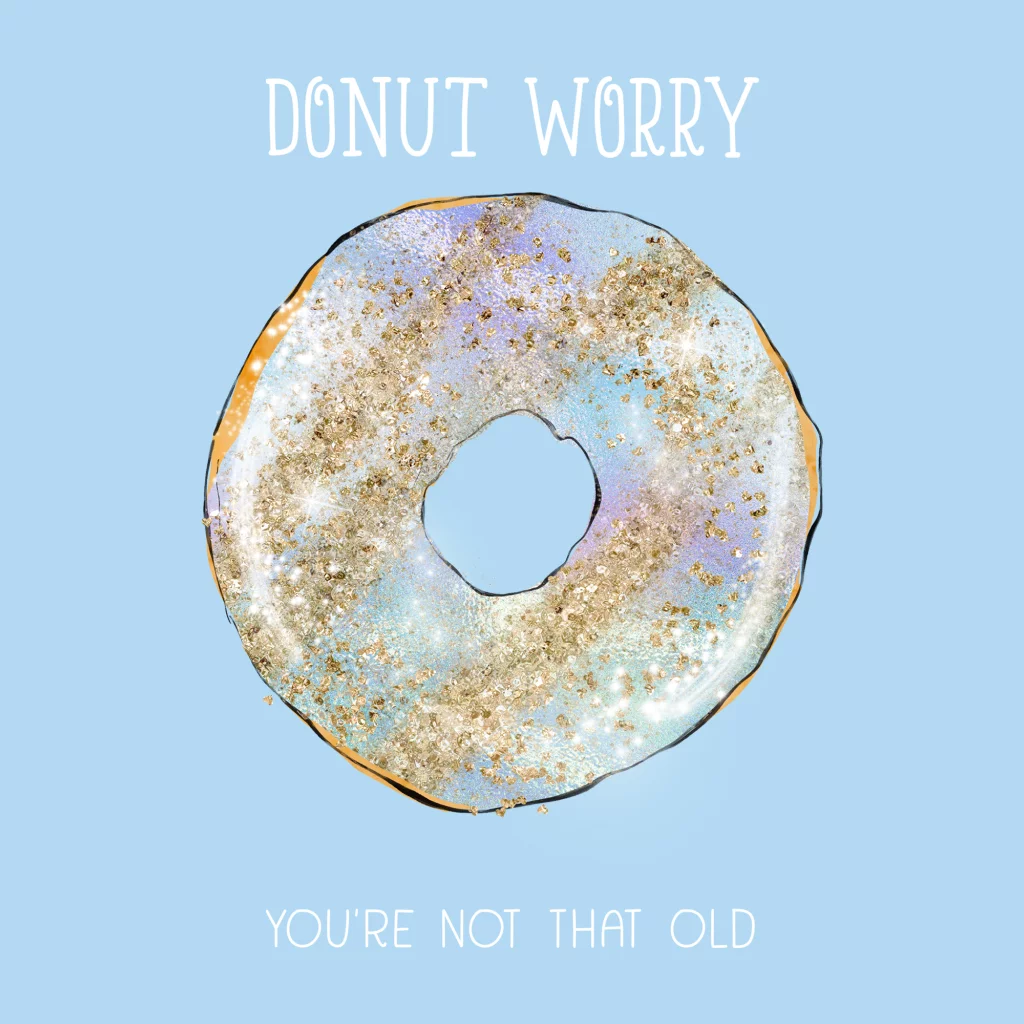 Een grappige verjaardagskaart in blauw met donut en de tekst Donut worry, you're not that old. Aan de binnenkant kun je een persoonlijke tekst voor de jarige schrijven.