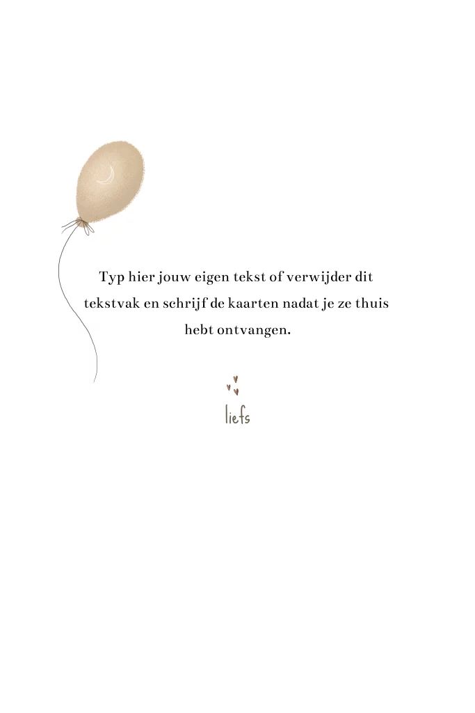 Een lief kaartje voor een felicitatie. Leuk voor een verjaardag of geboorte. Met bruine ballonnen zwevend in de wolkjes. Pas de tekst Gefeliciteerd eenvoudig aan in de editor. Aan de binnenkant kun je een persoonlijk berichtje schrijven.