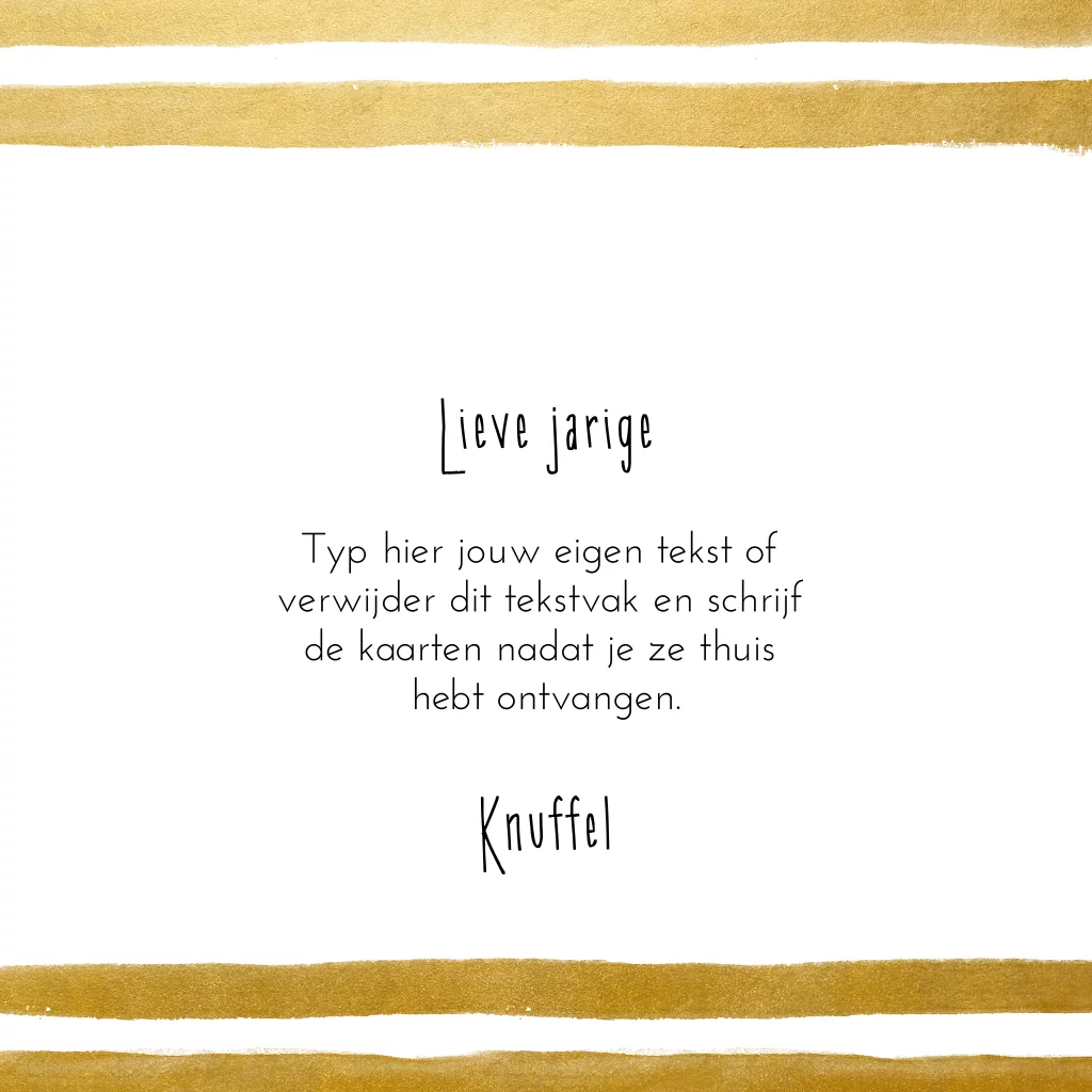 Een vrolijke verjaardagskaart met gouden waterverf strepen en op de voorzijde de tekst Happy birthday to you. Aan de binnenzijde kun je een persoonlijke boodschap schrijven voor de jarige.