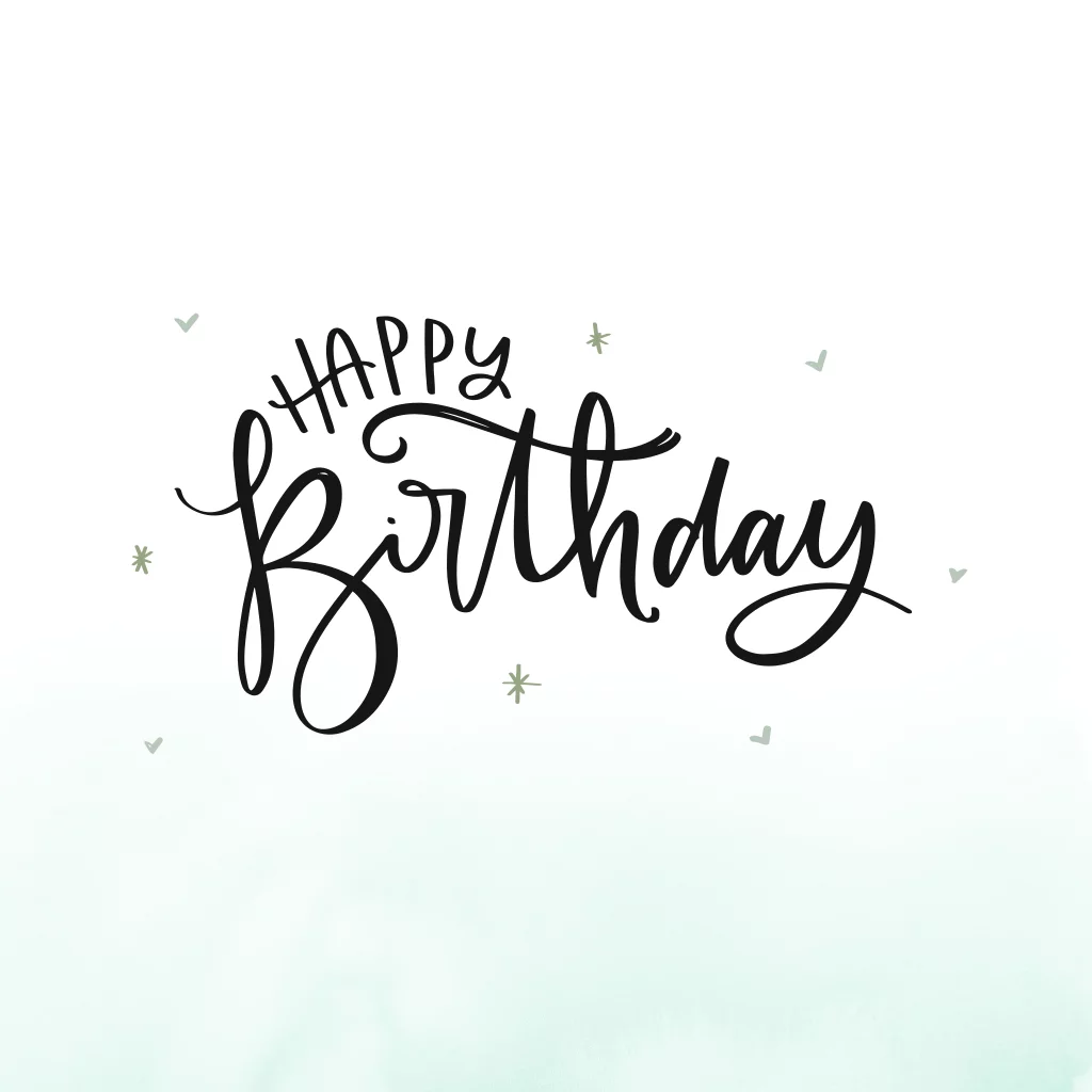 Een hippe verjaardagkaart met op de voorzijde groene waterverf en de tekst Happy Birthday. De kleur van de sterretjes en hartjes kun je eenvoudig aanpassen in de editor.