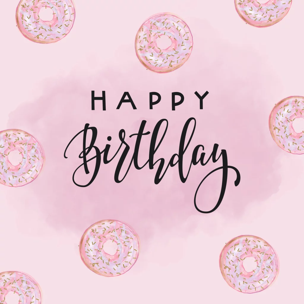 Een vrolijke verjaardagskaart met kleine roze donuts. Op de voorzijde staat de tekst Happy Birthday. Aan de binnenzijde kun je een persoonlijke boodschap voor de jarige schrijven.
