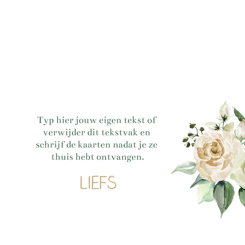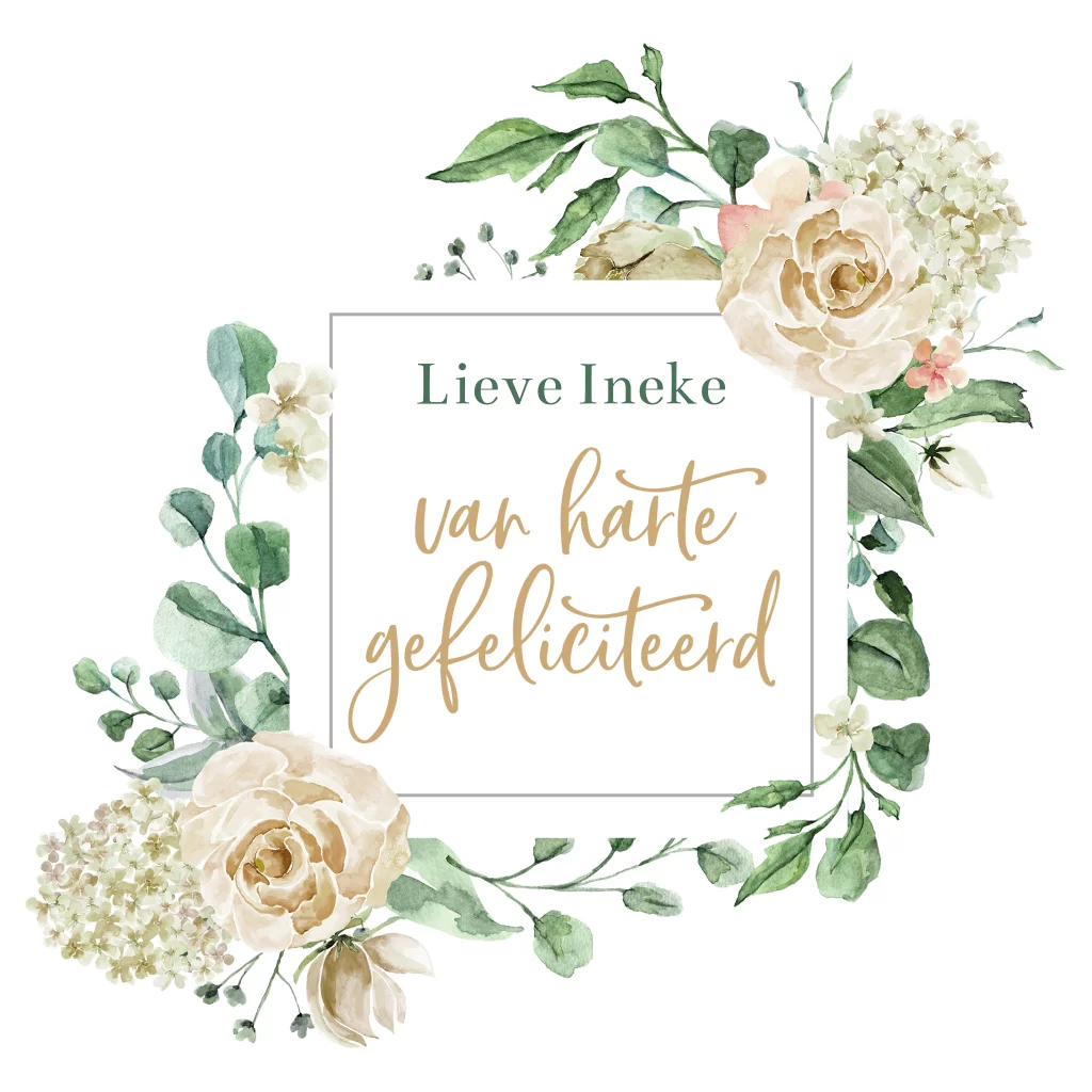 Een klassieke verjaardagskaart met geschilderde witte bloemen in watercolour en de tekst van harte gefeliciteerd. Op de voorzijde kun je de naam van de jarige toevoegen. Aan de binnenkant kun je een persoonlijke boodschap schrijven.