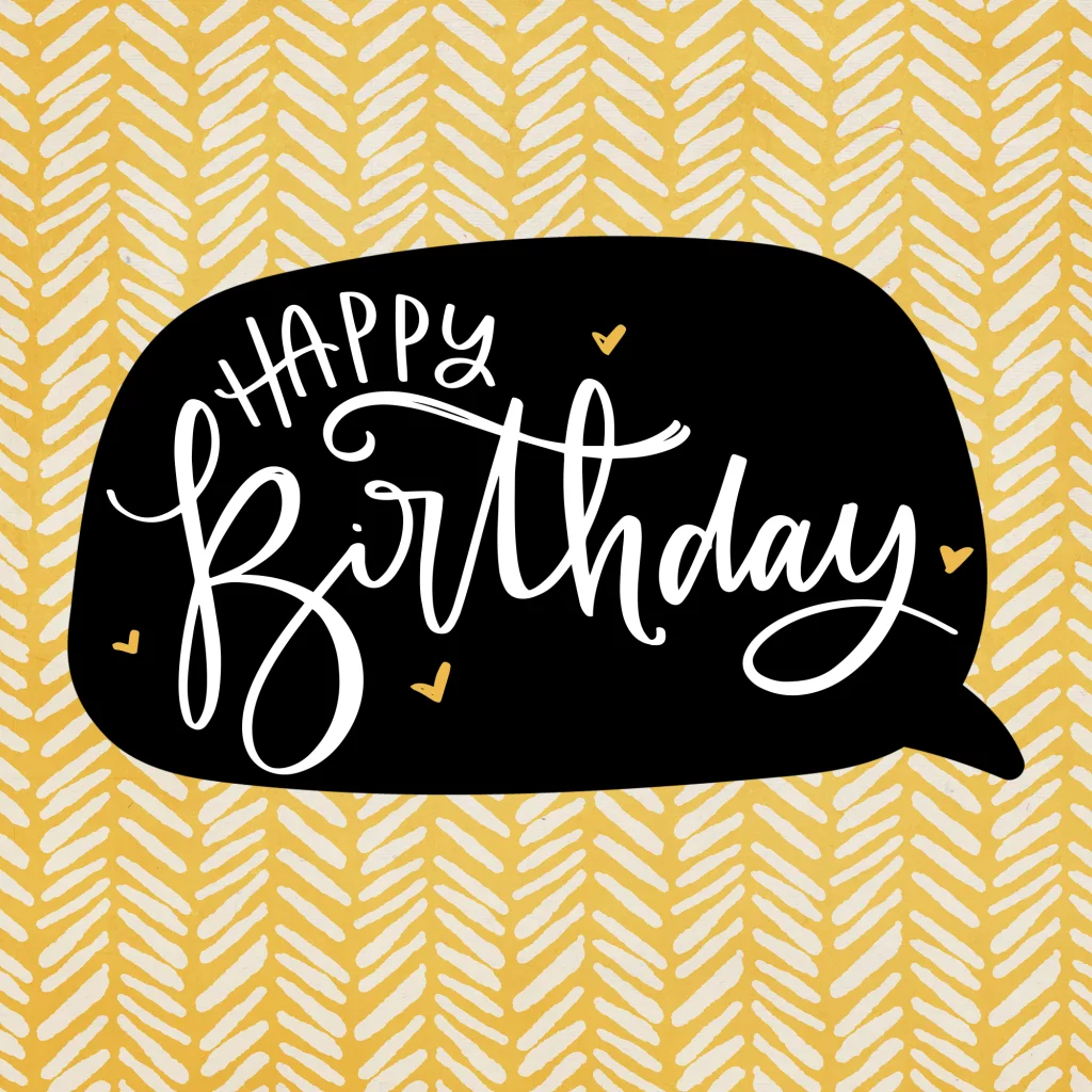 Een vrolijke, gele verjaardagskaart met de tekst Happy Birthday en gele hartjes. Ook verkrijgbaar in roze. Aan de binnenkant kun je een persoonlijke boodschap schrijven voor de jarige.